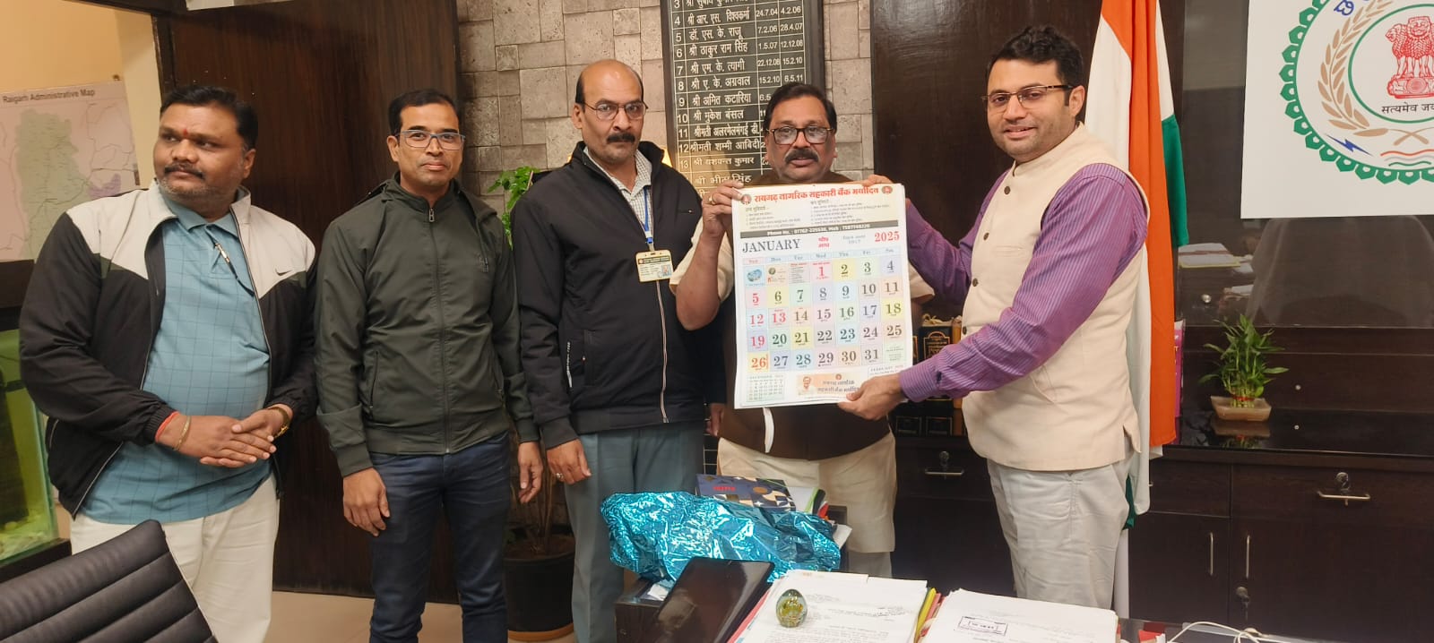 रायगढ़ नागरिक सहकारी बैंक के वर्ष 2025 के वार्षिक कैलेंडर का कलेक्टर श्री कार्तिकेय गोयल जी ने कलेक्ट्रेट कार्यालय में विमोचन किया। जिसमें उन्होंने बैंक के उज्जवल भविष्य की कामना की साथ ही साथ उन्होंने बैंक के द्वारा किए जा रहे कार्य की प्रशंसा की एवं बैंक को हर संभव मदद करने का भरोसा दिया ।उक्त विमोचन कार्यक्रम में बैंक के चेयरमैन श्री संतोष अग्रवाल जी मैनेजर केशव पटेल सहायक प्रबंधक मोहम्मद युनूस कैशियर हेमंत श्रीवास शिव कुमार रवानी देव शरण सिदार एवं बैंक के वरिष्ठ सदस्य दिनेश जायसवाल हरे राम तिवारी जगदीश मेहर उपस्थित थे ।