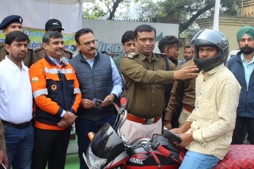 रायगढ़ में सड़क सुरक्षा अभियान: बिना हेलमेट चालकों को निशुल्क हेलमेट वितरित, यातायात नियमों की दी गई जानकारी