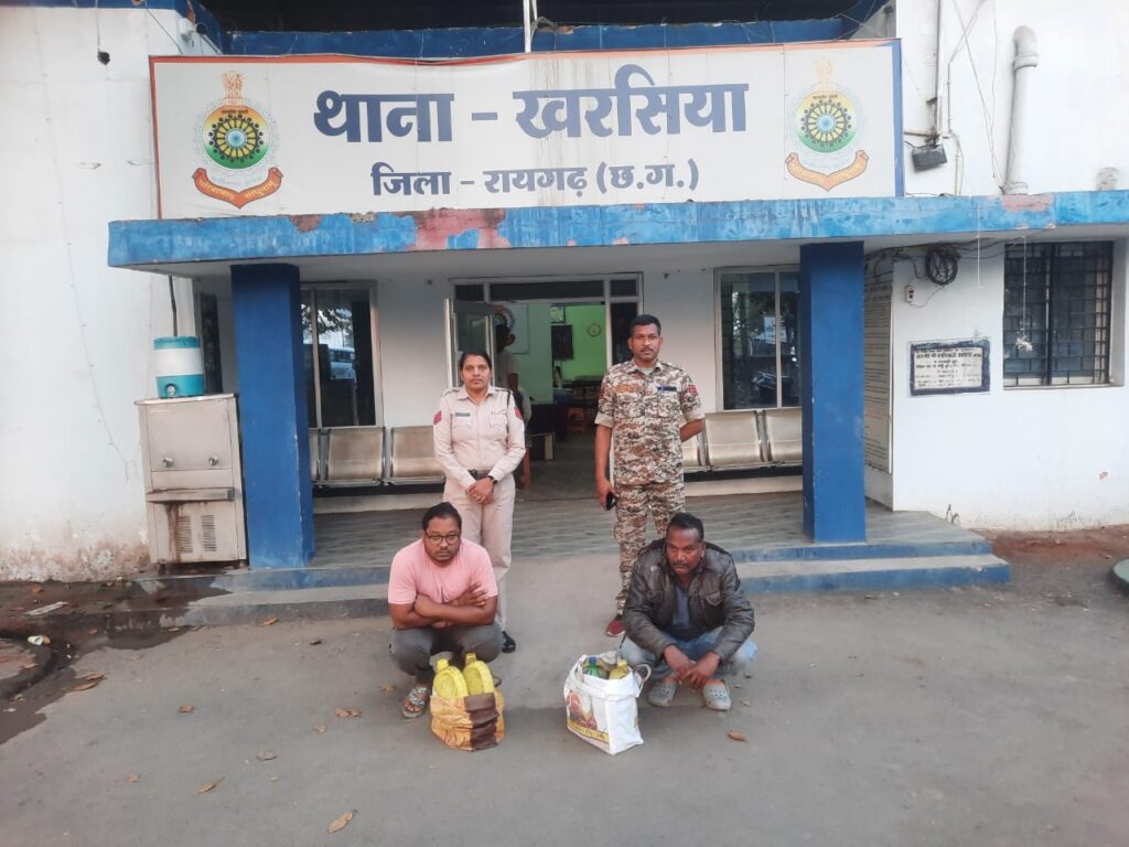 गीधा और भालूचुंआ में खरसिया पुलिस की शराब रेड कार्रवाई: 22 लीटर अवैध महुआ शराब बरामद, दो गिरफ्तार
