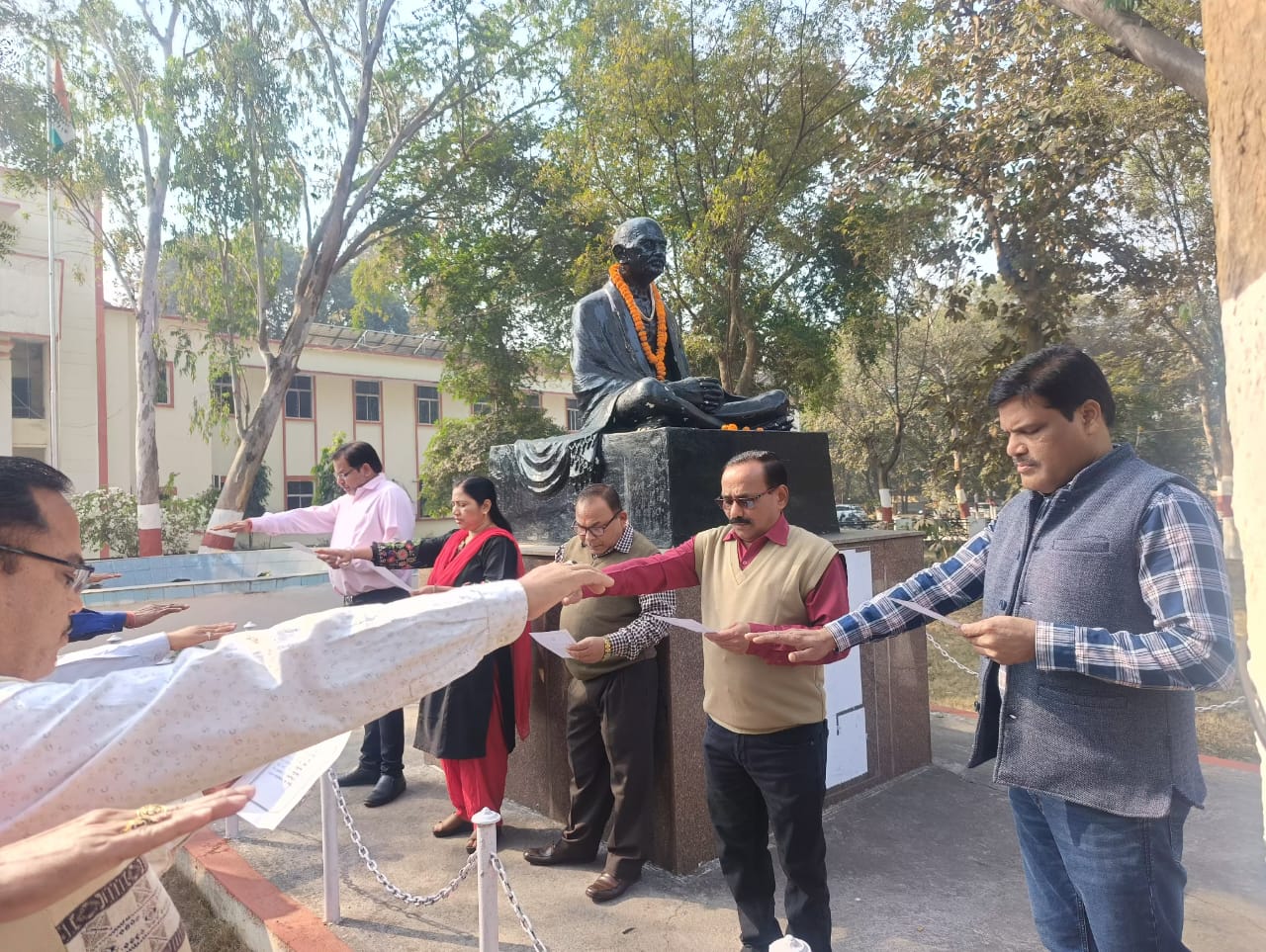 रायगढ़, कलेक्टोरेट परिसर में आज कलेक्ट्रेट के अधिकारी एवं कर्मचारियों ने सामूहिक रूप से मतदाता शपथ लिए। सभी ने शपथ किया कि हम, भारत के नागरिक लोकतंत्र में अपनी पूर्ण आस्था रखते हुए यह शपथ लेते हैं कि हम अपने देश की लोकतांत्रिक परम्पराओं की मर्यादा को बनाये रखेंगे तथा स्वतंत्र, निष्पक्ष एवं शांतिपूर्ण निर्वाचन की गरिमा को अक्षुण्ण रखते हुए, निर्भीक होकर, धर्म, वर्ग, जाति, समुदाय, भाषा अथवा अन्य किसी भी प्रलोभन से प्रभावित हुए बिना सभी निर्वाचनों में अपने मताधिकार का प्रयोग करेंगें। इस अवसर पर ज्वाइंट कलेक्टर श्री राकेश कुमार गोलछा, जिला कोषालय अधिकारी श्रीमती ज्योति सिंह, जिला अल्प बचत अधिकारी श्री जगजीवन राम जांगड़े, कार्यालय अधीक्षक श्री सतीश कुमार सिन्हा, सहायक अधीक्षक श्री राजेश मेहरा सहित जिला कार्यालय के अन्य अधिकारी-कर्मचारी उपस्थित रहे।