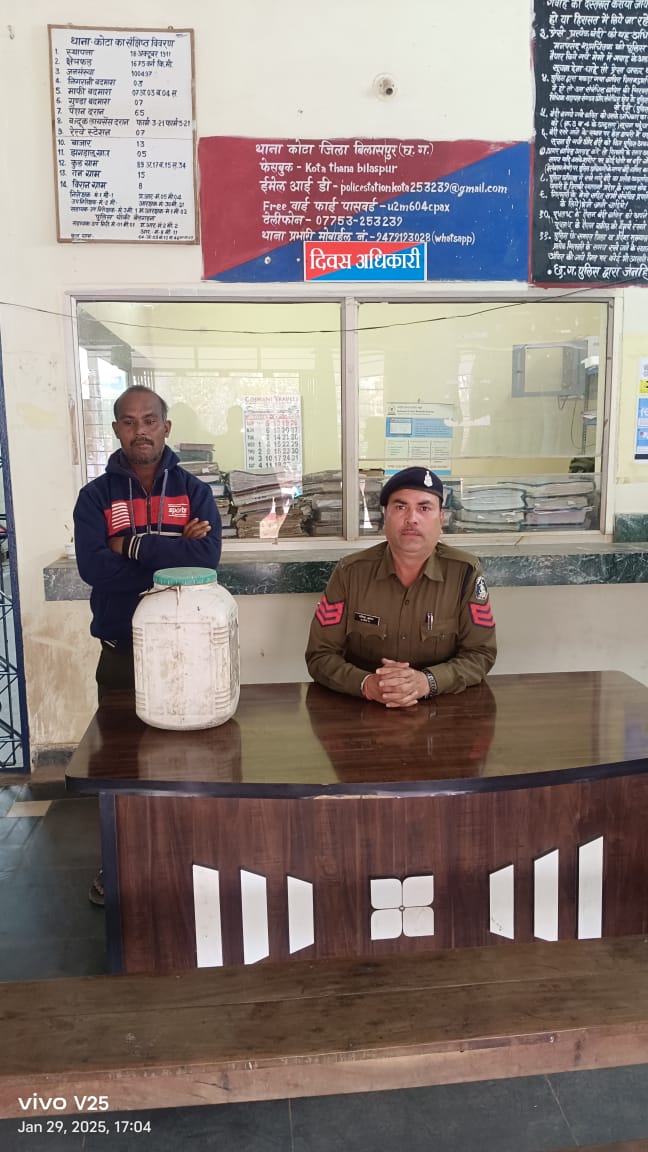 बिलासपुर। पुलिस अधीक्षक बिलासपुर रजनेश सिंह (IPS) के द्वारा जिला में अवैध शराब बेचने वालों के विरुद्ध त्वरित व सख्त कार्यवाही करने निर्देशित किया गया है। उच्च अधिकारियों के मार्गदर्शन में कोटा पुलिस द्वारा ग्राम नेवरा में मुखबिर सूचना के आधार पर रेड कार्यवाही किया गया जो आरोपी राज कुमार खांडे पिता स्व.मोहित खांडे उम्र 47 वर्ष पता नेवरा थाना कोटा जिला बिलासपुर के कब्जे से 12 लीटर कच्ची महुआ शराब जप्त कर धारा 34(2)आबकारी अधिनियम के तहत विधिवत् कार्यवाही की गई।