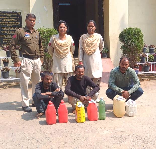 रायगढ़* । पुलिस अधीक्षक श्री दिव्यांग पटेल के दिशा-निर्देशन एवं नगर पुलिस अधीक्षक श्री आकाश शुक्ला के मार्गदर्शन में कल थाना प्रभारी निरीक्षक प्रशांत द्वारा अवैध शराब के खिलाफ सख्त कार्रवाई की। थाना प्रभारी को ग्राम लोईंग में अवैध शराब बनाने और विक्रय की सूचना मिली थी जिस पर थाना प्रभारी ने थाने के विवेचकों की अलग-अलग टीमें बनाई और कल शाम गांव पहुंचकर महिला समिति के सदस्यों और गांव के प्रमुख लोगों को साथ लेकर एक साथ कई ठिकानों पर छापेमारी की ।पुलिस टीम की छापेमारी पर अवैध महुआ शराब के साथ तीन आरोपियों को हिरासत में लिया, आरोपियों से कुल 37 लीटर अवैध महुआ शराब (₹4700) जप्त किया गया है । आरोपियों थाना चक्रधरनगर में पृथक पृथक आबकारी एक्ट की धारा 34(2),59(क) के तहत कार्यवाही कर आज रिमांड पर भेजा गया है।
