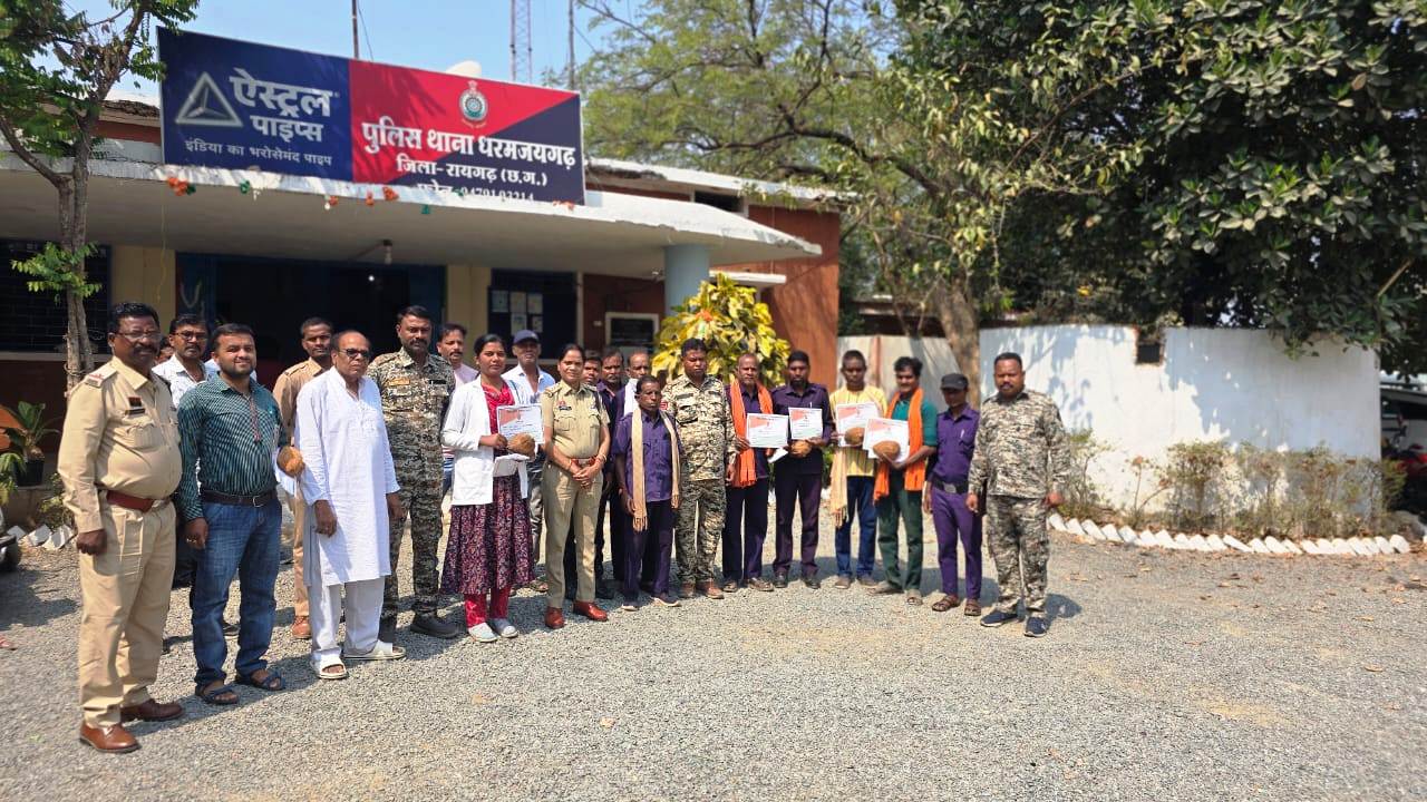 रायगढ। त्रि-स्तरीय चुनाव के शांतिपूर्ण आयोजन में अहम भूमिका निभाने वाले विभिन्न विभागों के कर्मचारियों को सम्मानित किया गया। पुलिस अधीक्षक श्री दिव्यांग कुमार पटेल के निर्देशन में थाना प्रभारी धरमजयगढ़ निरीक्षक कमला पुसाम ठाकुर द्वारा थाना परिसर में सम्मान समारोह आयोजित किया गया।