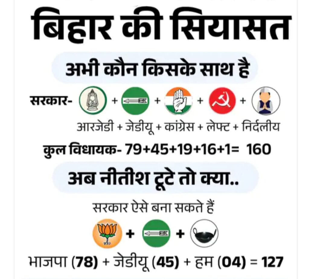 Nitish Kumar ने Bihar के मुख्यमंत्री पद से इस्तीफा दे दिया है। उनके इस्तीफे के बाद उन्होंने BJP के सहयोग से सरकार बनाने का दावा पेश किया। BJP की मीटिंग में Samrat Choudhary और Vijay Sinha को विधायक दल का नेता और उपनेता चुन लिया गया है। मीडिया रिपोर्ट्स में दावा किया जा रहा है कि ये दोनों नई सरकार में Deputy CM होंगे। नई सरकार में Nitish Kumar के साथ 8 मंत्री शपथ लेंगे।