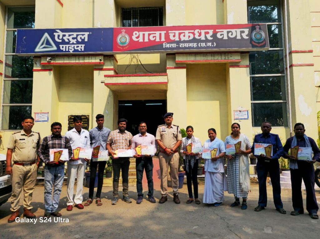 रायगढ़* । रायगढ़ के चक्रधरनगर थाना परिसर में आज एक विशेष कार्यक्रम आयोजित किया गया, जिसमें मेधावी छात्रों, समर्पित शिक्षकों, नर्सिंग स्टाफ, ग्राम कोटवारों और पुलिस मित्रों को उनके उत्कृष्ट कार्यों के लिए सम्मानित किया गया। पुलिस अधीक्षक श्री दिव्यांग कुमार पटेल के निर्देश पर आयोजित इस कार्यक्रम में थाना प्रभारी निरीक्षक प्रशांत राव ने इन सेवाभावी लोगों को मोमेंटो और प्रशस्ति पत्र देकर उनका उत्साहवर्धन किया।