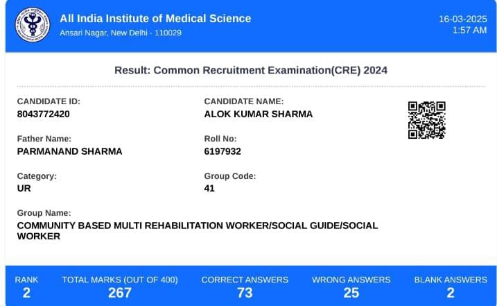 रायगढ़ :- छत्तीसगढ़ के रायगढ़ जिले के आलोक कुमार शर्मा ने देशभर में आयोजित AIIMS की CRE परीक्षा में दूसरा स्थान हासिल किया है, जो एक अद्वितीय और गर्वित उपलब्धि है। यह परीक्षा 26 फरवरी को आयोजित की गई थी और इसके परिणाम इसी हफ्ते घोषित किए गए हैं।